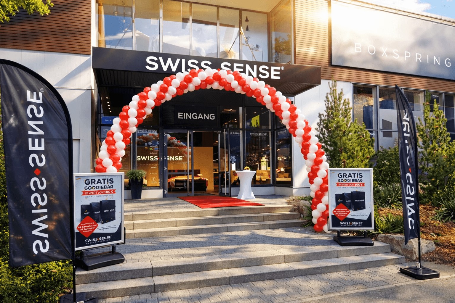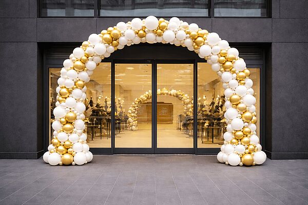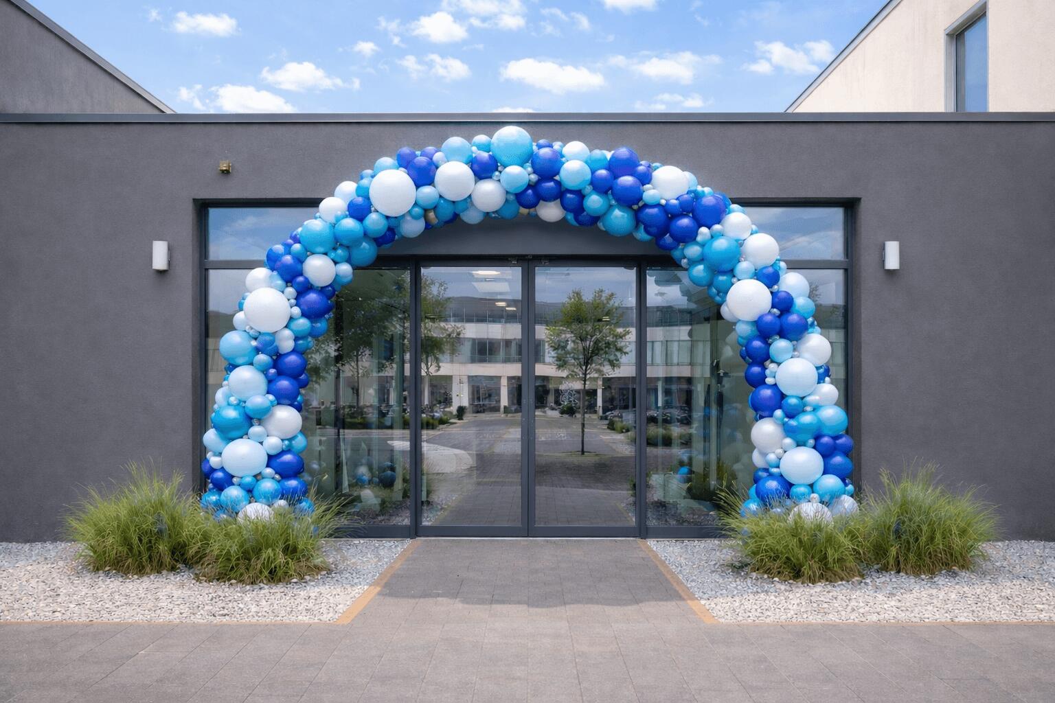 Die Farbgestaltung ist bei den Ballonsäulen und Ballonbögen frei wählbar. Der Vorteil ist die Flexibilität, da die Bögen "frei" stehen und kein Befestigungspunkt an einer Fassade/Wand benötigt wird.